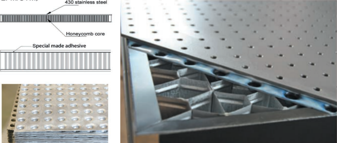 High density honeycomb core optical breadboard is widely applied in the scientific fields of optical experiments, medical researches,high precision devices manufacturing and testing as well as aviation labs etc.Its features of high rigidity and low self weight, providing a solid mounting platform for the experiments hence ensure the accuracy of the experiment applica- tions.The breadboard is designed with a structure of top and bottom skins,honeycomb cores and sealed cups.